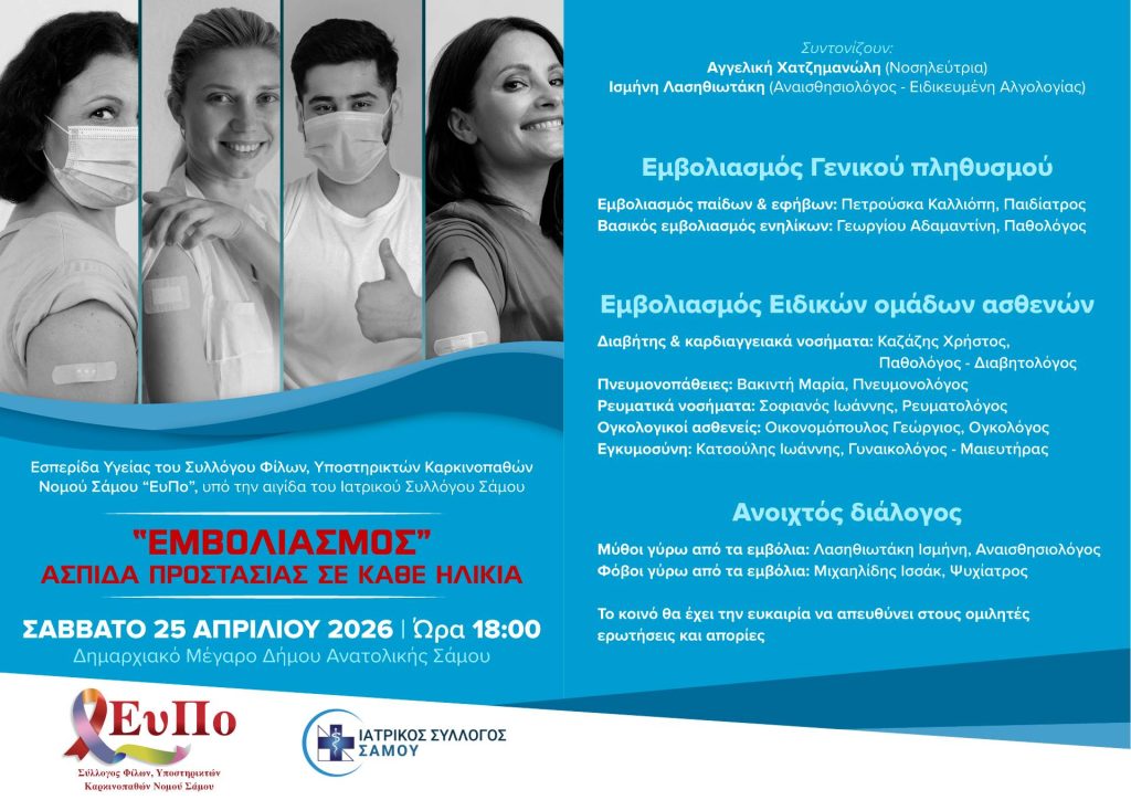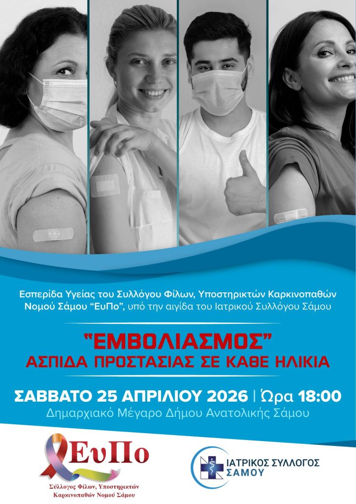 Ο Σύλλογος Φίλων, Υποστηρικτών Καρκινοπαθών Νομού Σάμου “ΕυΠο” υπό την αιγίδα του Ιατρικού Συλλόγου Σάμου σας προσκαλεί στην εσπερίδα με θέμα: “Εμβολιασμός: Ασπίδα Προστασίας σε κάθε Ηλικία” που θα διεξαχθεί το Σάββατο 25 Απριλίου στις 18:00 στο Δημαρχιακό Μέγαρο του Δήμου Ανατολικής Σάμου.
