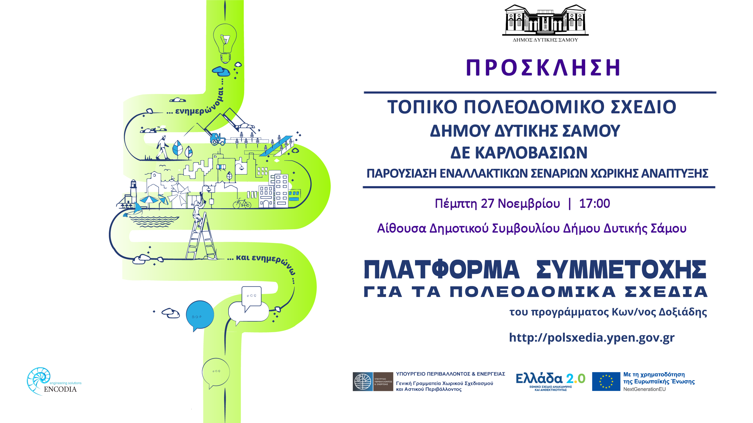 Ο Δήμος Δυτικής Σάμου ενημερώνει ότι την Πέμπτη 27 Νοεμβρίου 2025 , στις 17:00 μ.μ. η ώρα στην αίθουσα του Δημοτικού Συμβουλίου του Δήμου Δυτικής Σάμου , θα πραγματοποιηθεί η παρουσίαση των Εναλλακτικών Αναπτυξιακών Σεναρίων Χωρικής Οργάνωσης στο πλαίσιο του 1ου Σταδίου της Α Φάσης της μελέτης του Τοπικού Πολεοδομικού Σχεδίου ( Τ.Π.Σ.) για την Δημοτική Ενότητα Καρλοβασίων.